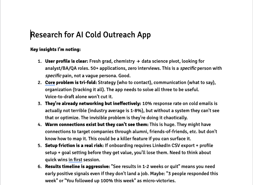 So I told Claude exactly who it is: an expert founder and product strategist who's built successful networking tools before. Someone who thinks critically about user behavior and can spot bad assumptions.