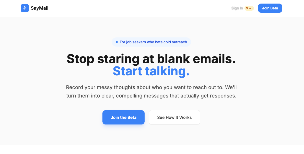 I'm reaching out to a small group of 5-10 random people to test the first version of SayMail. You'll get a link to create an account, a short video walkthrough on how to get started, and a chance to try drafting your own messages.