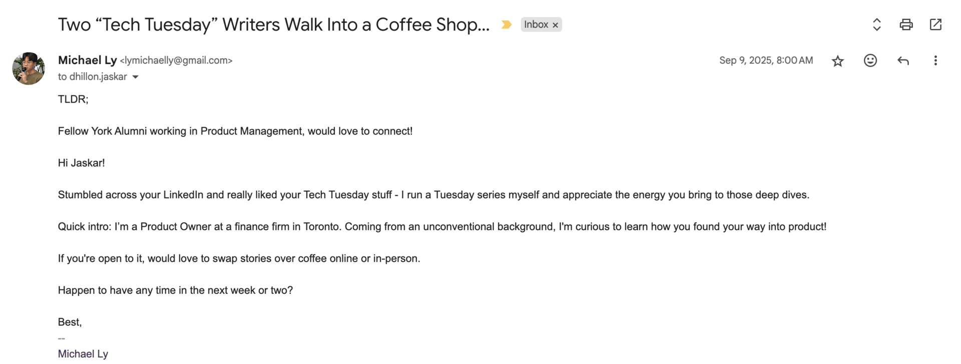 Notice how brief it is, but also notice my attempt to connect with Jaskar within the subject line.