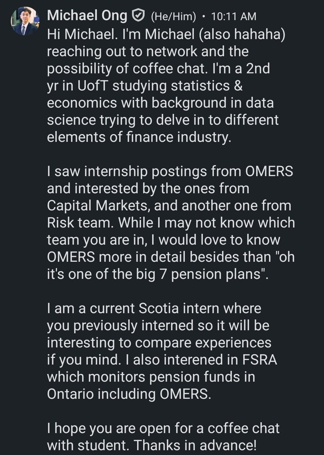 Michael Ongβs cold message is a great example of how to reach out to people.